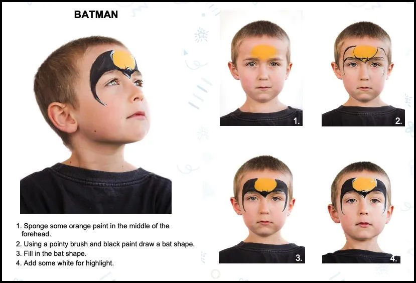 Easy to follow steps so you can explore your creativity and get great results from your very first go! This book may also be handy for kids to choose their favourite face paint. It contains popular designs like butterfly, superman, clown or bunny face.